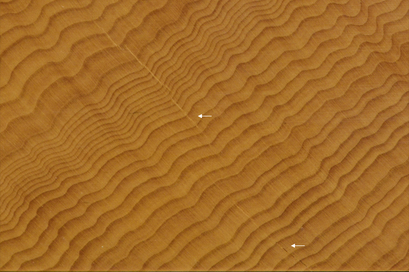 宮崎県伝統工芸士の作品で、木表一枚板の本榧卓上将棋盤。目盛りは「太刀盛り」で、6面すべて蝋仕上げです。天面は色ムラがなく、赤みがかったよい色あい。木目は荒々しく複雑なうねりがあり、野趣あふれる独特の風合いです。天面は無キズで、木口から裏面にかけて細い割れ跡がありますが、キズ口はくっついており広がる心配はありません。しっかりとした厚みで安定感があり、指し味を十分お楽しみいただけます。