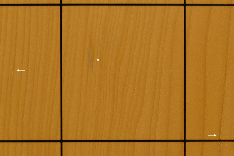 宮崎県伝統工芸士の作品で、太刀盛り(たちもり)、蝋仕上げ。天柾一枚板の本榧卓上将棋盤です。色ツヤが良く赤みの強い色あいで、木目のはっきりとした鮮やかな木味。天面の柾目は揺れが多く、野趣あふれる自然な風合いです。天面にいくつか割れ跡がありますが、キズ口は落ち着いており広がる心配はありません。また、その他の面にもキズがありますがいずれも落ち着いており、キズ口の開いているものは樹脂で補修しています。ほどよい厚みで安定感もあり、持ち運びやすく、指し味も十分お楽しみいただけます。